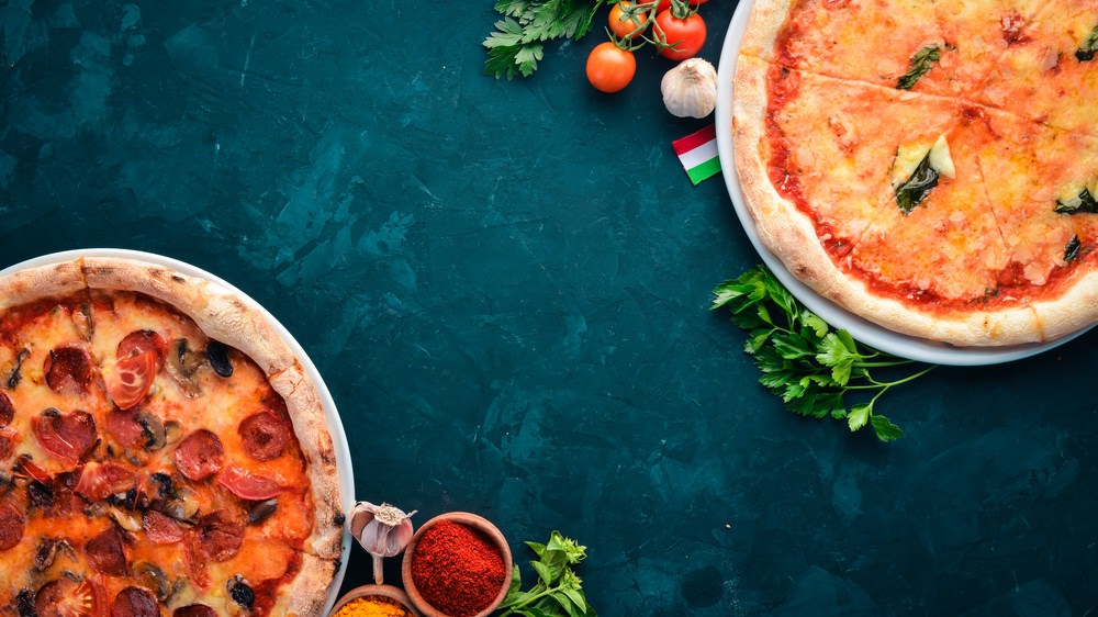 Tomatensaus, kaas, kalkoenham, kalfssalami, champignons, ui en paprika